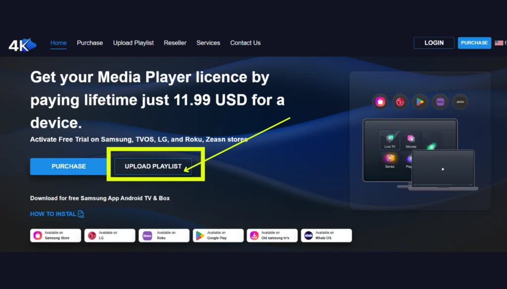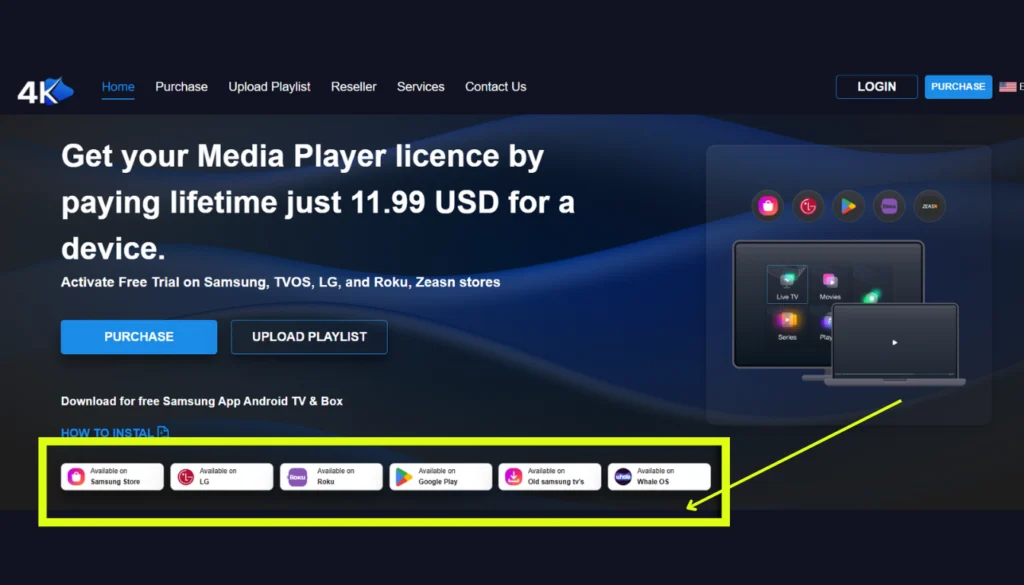 För att komma igång, gå till den officiella webbplatsen IPTV 4K . På startsidan hittar du nedladdningslänken som passar ditt operativsystem (APK för Android, App Store för iOS eller Smart TV Store).